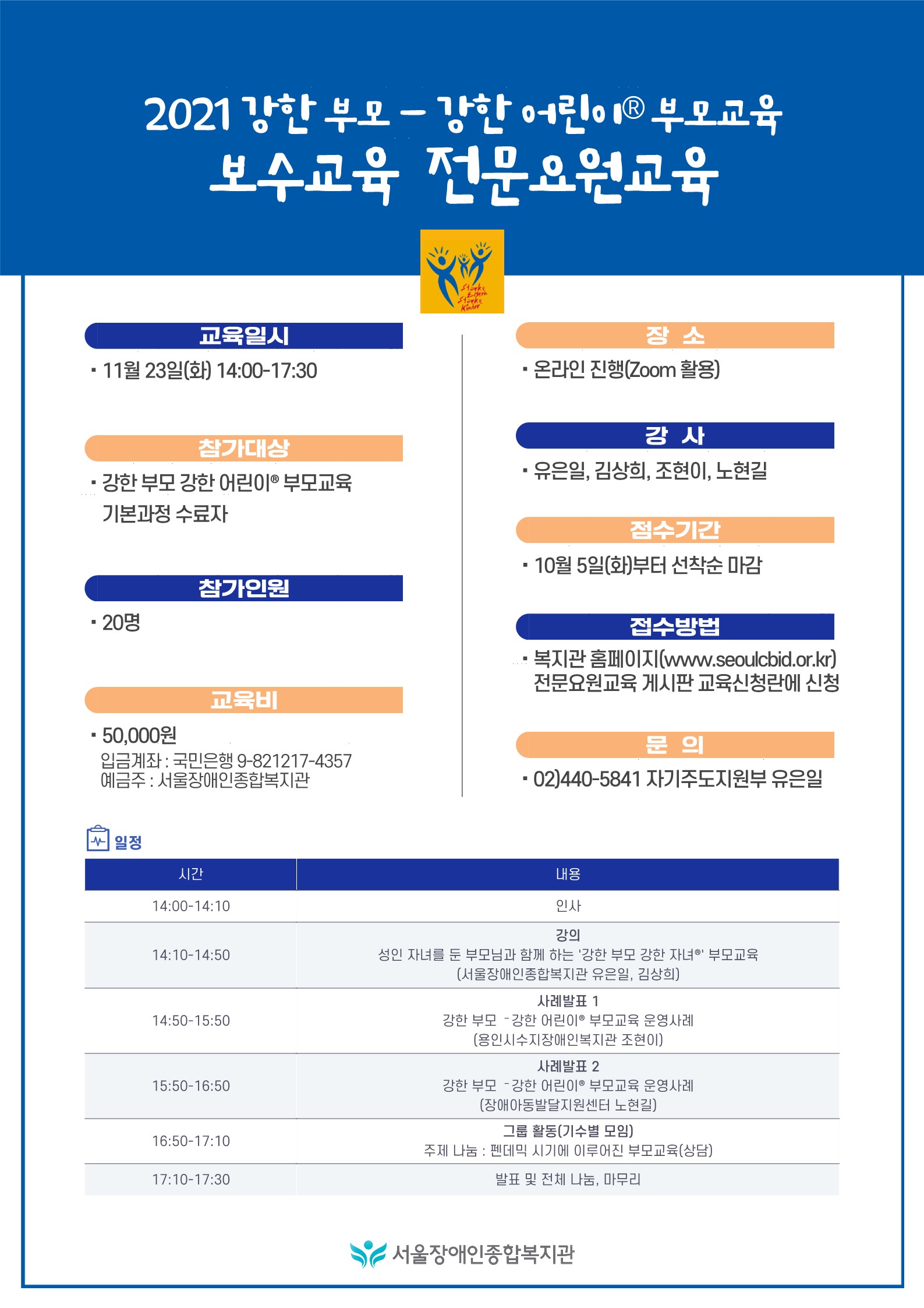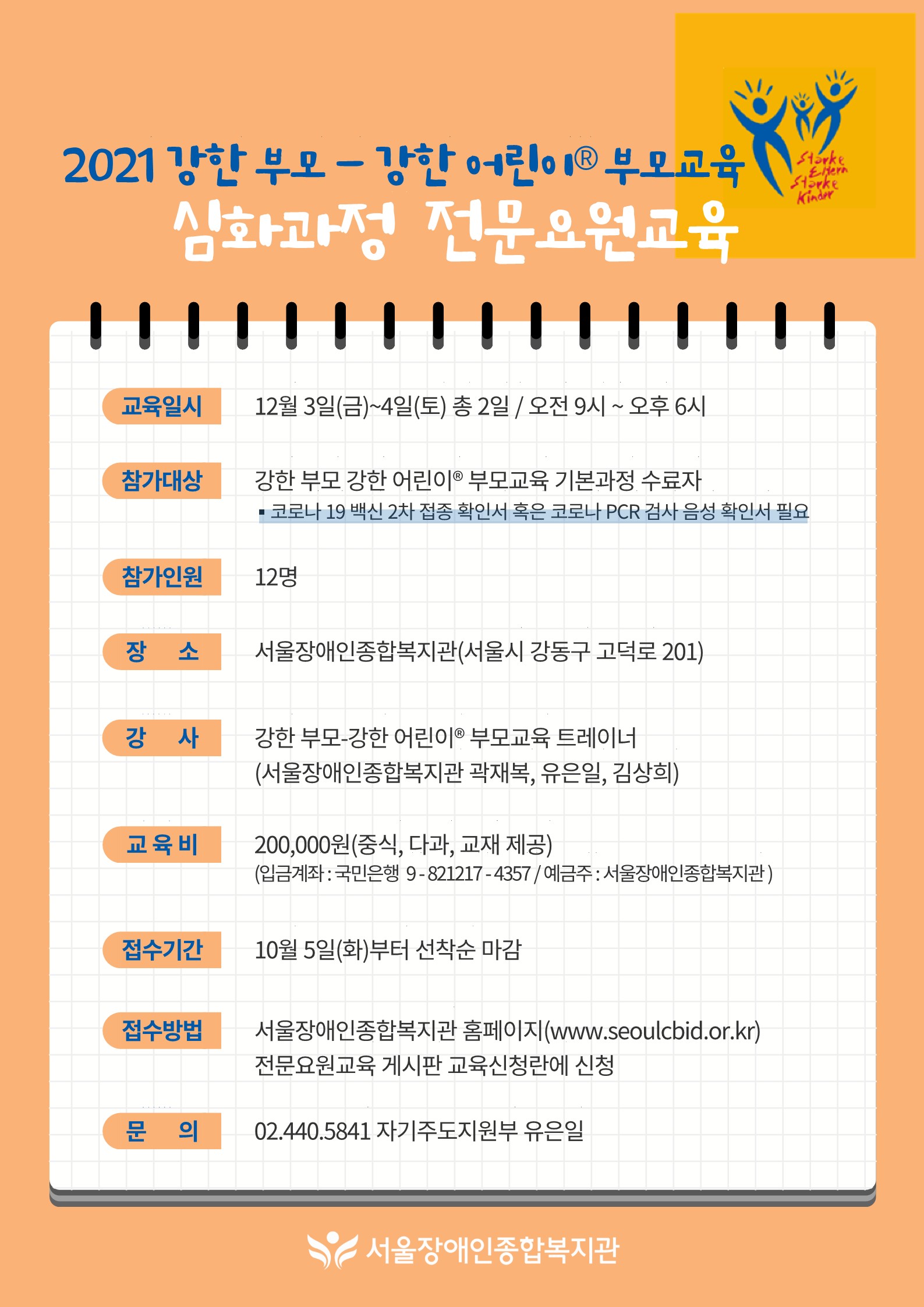 2) 교육 참가비 입금 : 국민은행 9-821217-4357(예금주 : 서울장애인종합복지관)