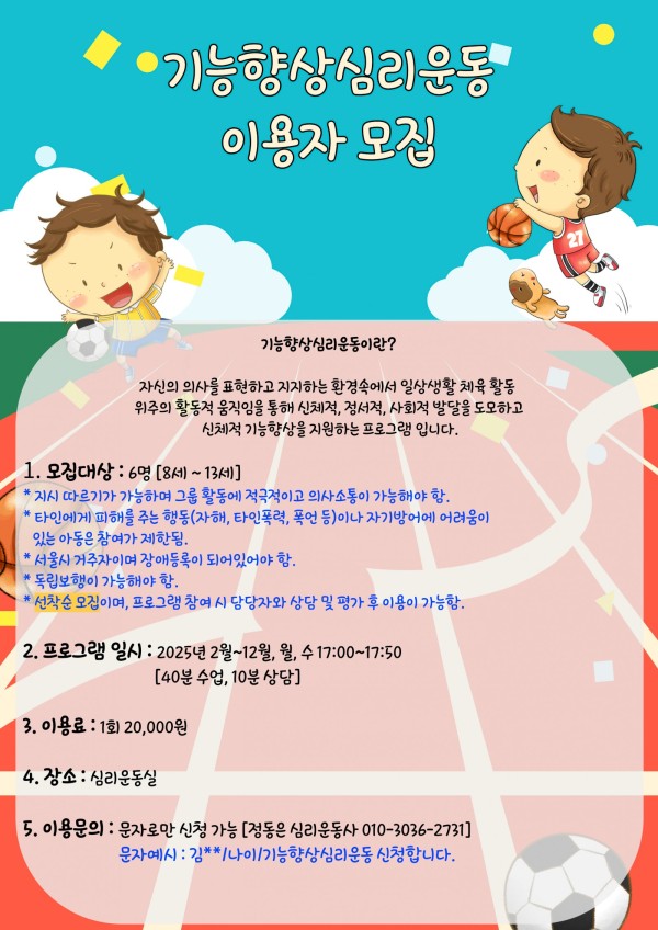 기능향상 심리운동 이용자 모집 안내드립니다.