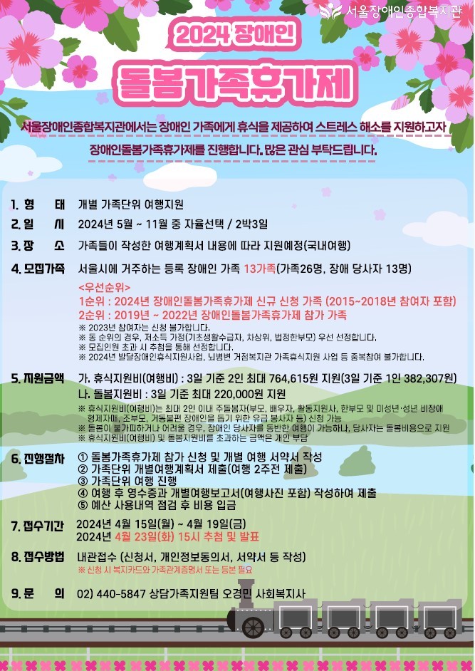 서울장애인종합복지관에서는 장애인 가족에게 휴식을 제공하여 스트레스 해소를 지원하고자 장애인돌봄가족휴가제를 진행합니다. 많은 관심 부탁드립니다.