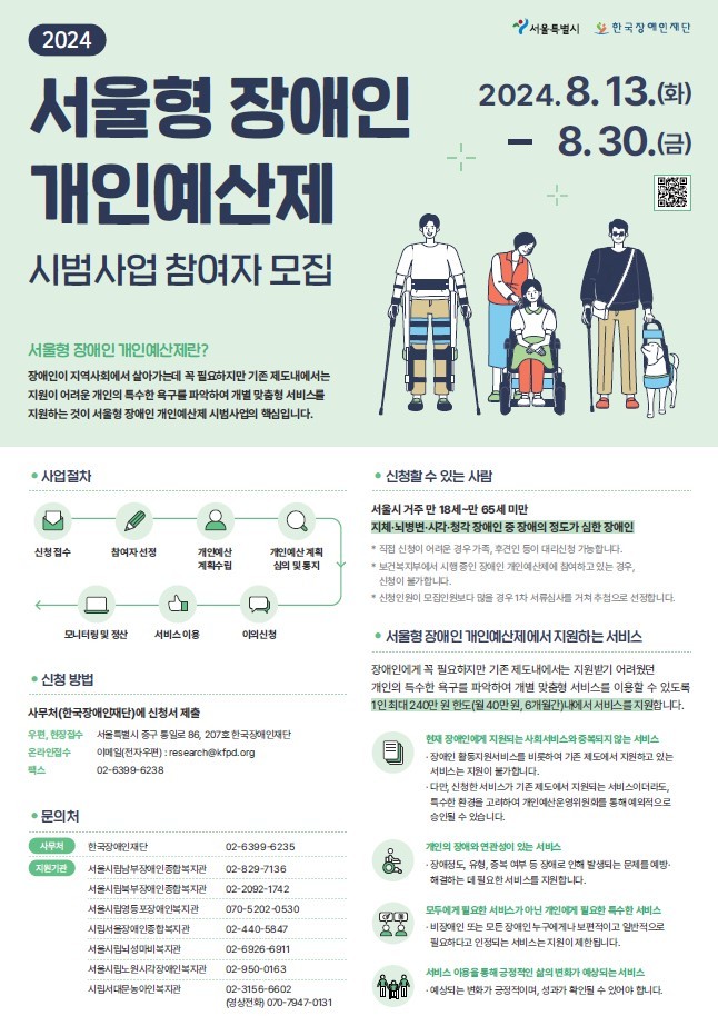 서울시에서 추진하는 "2024 서울시 장애인개인예산제 시범사업 운영"을 위한 사업 참여자를 아래와 같이 모집하오니, 많은 관심과 참여 바랍니다.