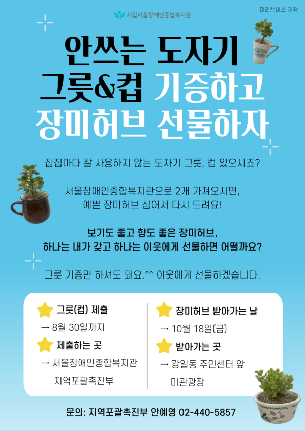서울장애인종합복지관으로 2개 가져오시면, 예쁜 장미허브 심어서 다시 드려요!