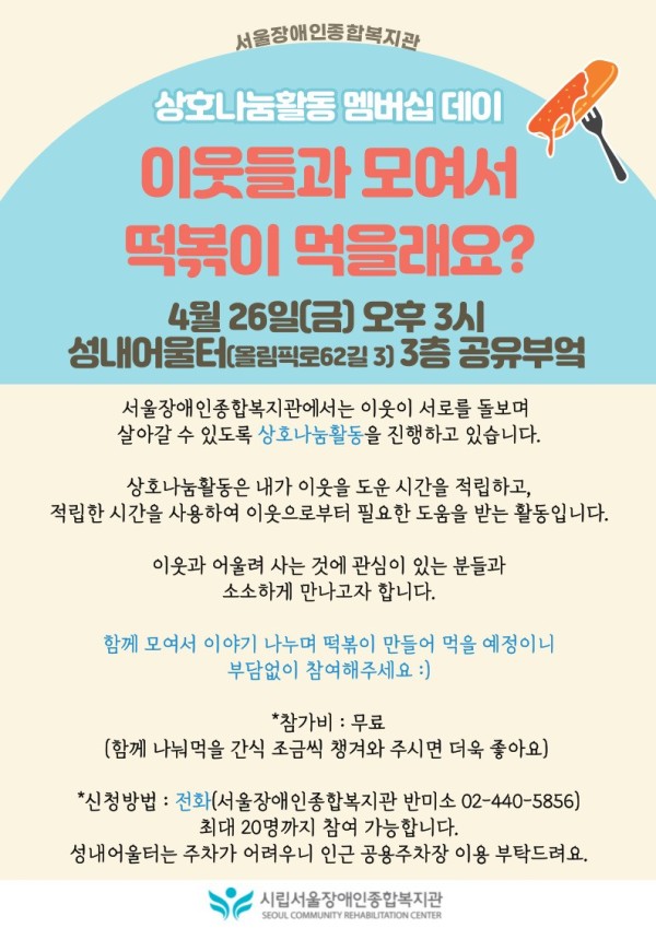 마감 [4월 상호나눔활동 멤버십 데이]이웃들과 모여서 떡볶이 먹을래요?