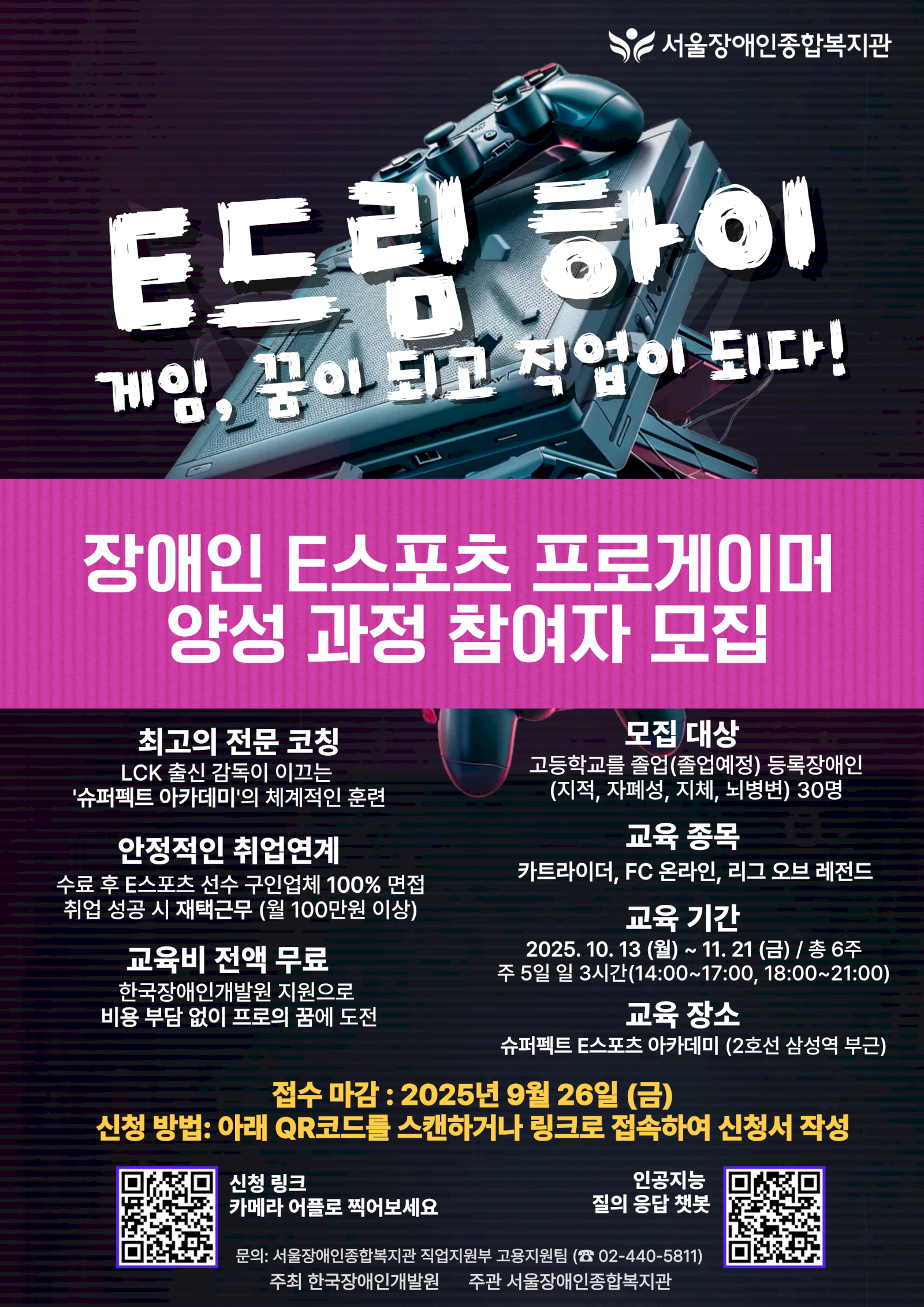 - 모집 대상: e스포츠에 관심과 재능이 있고 프로게이머로 취업을 희망하는 고등학교 졸업(예정) 이상의 지적, 자폐성, 지체, 뇌병변 장애인