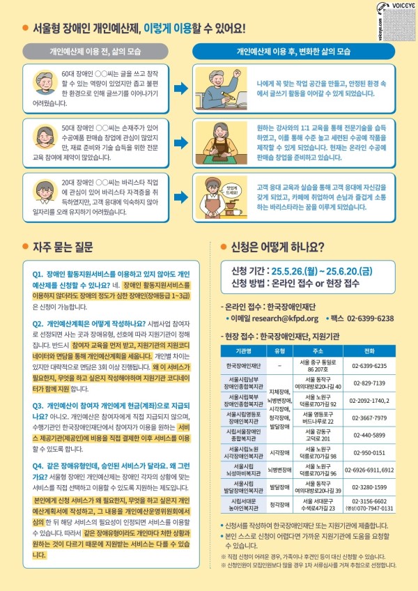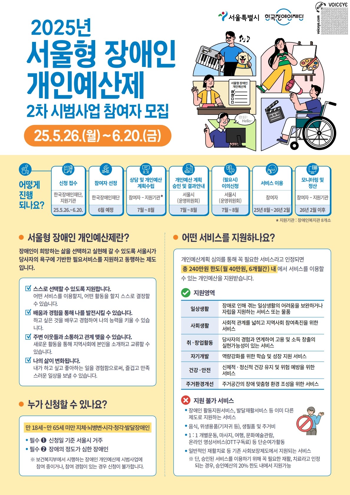 서울시에서 추진하는 "2025 서울시 장애인개인예산제 2차 시범사업 운영"을 위한 사업 참여자를 아래와 같이 모집하오니, 많은 관심과 참여 바랍니다.