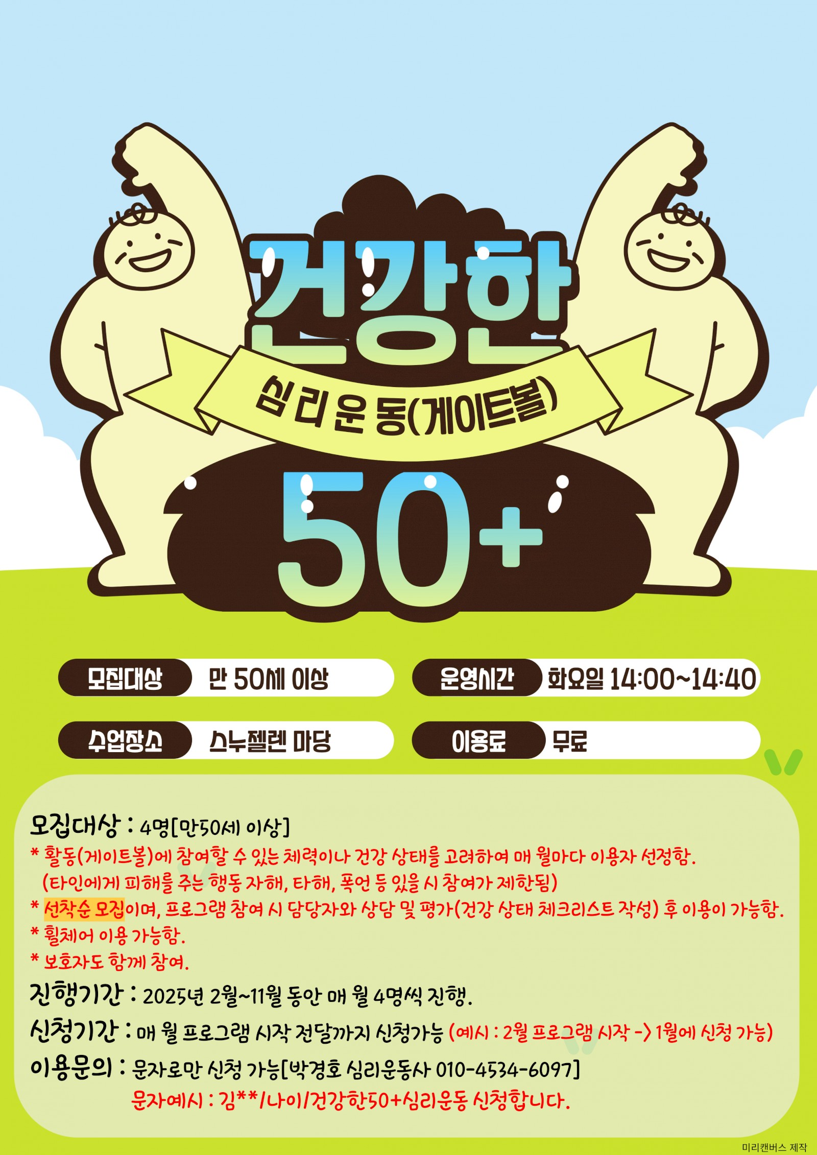 ※ 문자예시 : 김**/나이/건강한 50+ 심리운동 신청합니다.