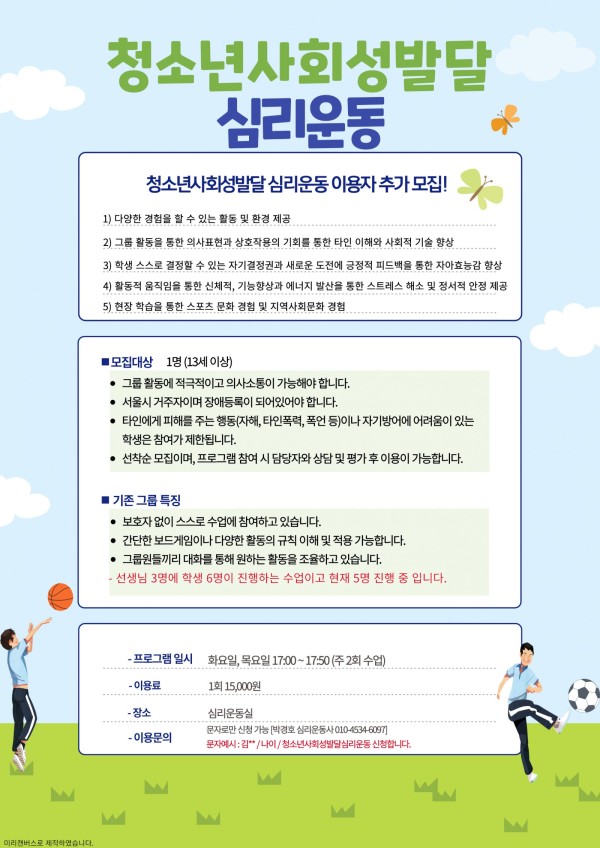 청소년사회성발달 심리운동 이용자 모집 안내드립니다.
