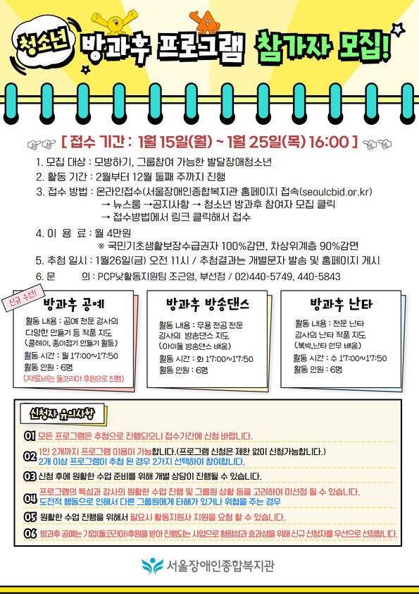 ◎ 신청자 유의사항 ★모든 프로그램은 추첨으로 진행되오니 접수기간에 신청 바랍니다. 1. 1인 2개까지 프로그램 이용이 가능합니다.(프로그램 신청은 제한 없이 신청가능합니다) -2개 이상 프로그램이 추첨 된 경우 2가지 선택하여 참여합니다. 2. 신청 후에 원활한 수업 준비를 위해 개별 상담이 진행될 수 있습니다. 3. 프로그램의 특성과 강사의 원활한 수업 진행 및 그룹원 상황 등을 고려하여 미선정 될 수 있습니다. -도전적 행동으로 인해서 다른 그룹원에게 타해가 있거나 위협을 주는 경우 4. 원활한 수업 진행을 위해서 필요시 활동지원사 지원을 요청 할 수 있습니다. 5. 방과후 공예는 기업후원을 받아 진행되는 사업으로 형평성과 효과성을 위해 신규 신청자 우선으로 선정합니다. |