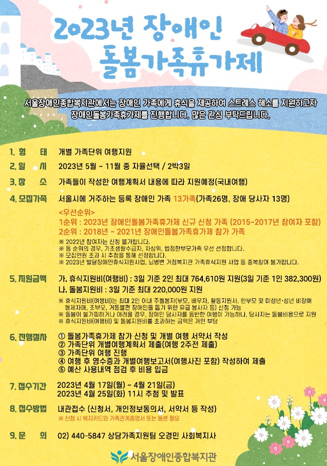 마감 2023년 장애인돌봄가족휴가제 참가가족 모집(신청기간: 4/17-21)
