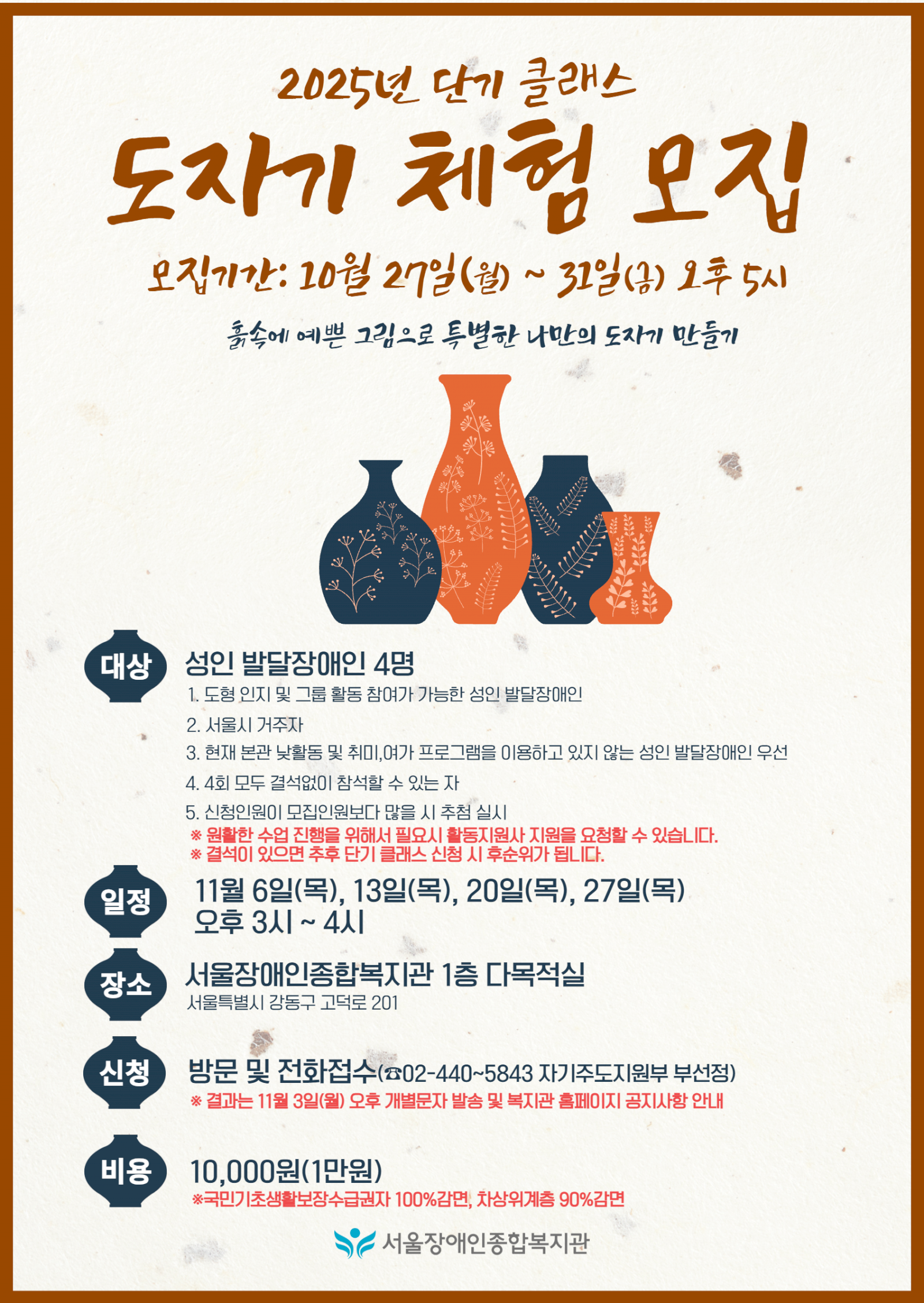 마감 2025년 성인 발달장애인 단기 클래스 도자기 체험 모집
