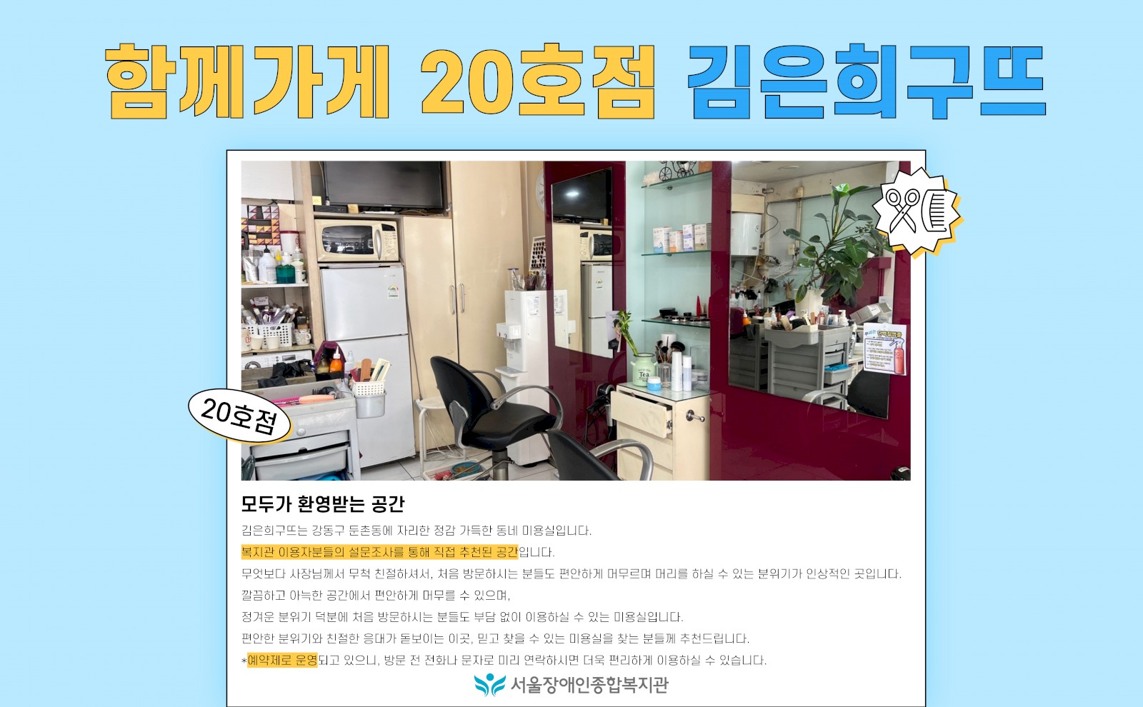 김은희구뜨는 강동구 둔촌동에 있는 정겨운 미용실이에요. 복지관 이용자들이 직접 설문조사로 추천한 곳이기도 하죠.