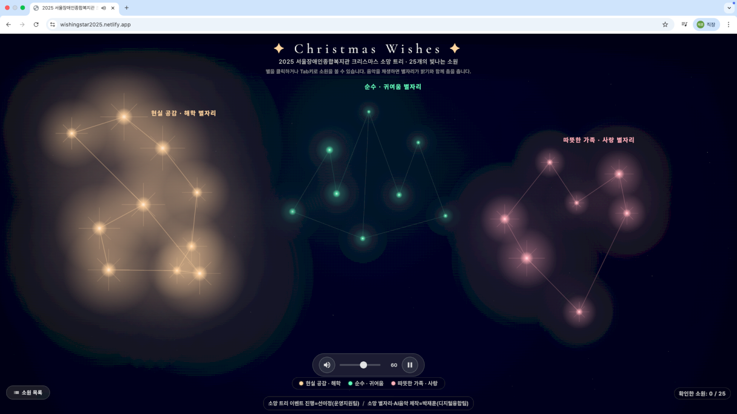 2026년 2월, 복지관은 소원 중 25개를 추려서 밤하늘의 별자리로 만들었습니다.
