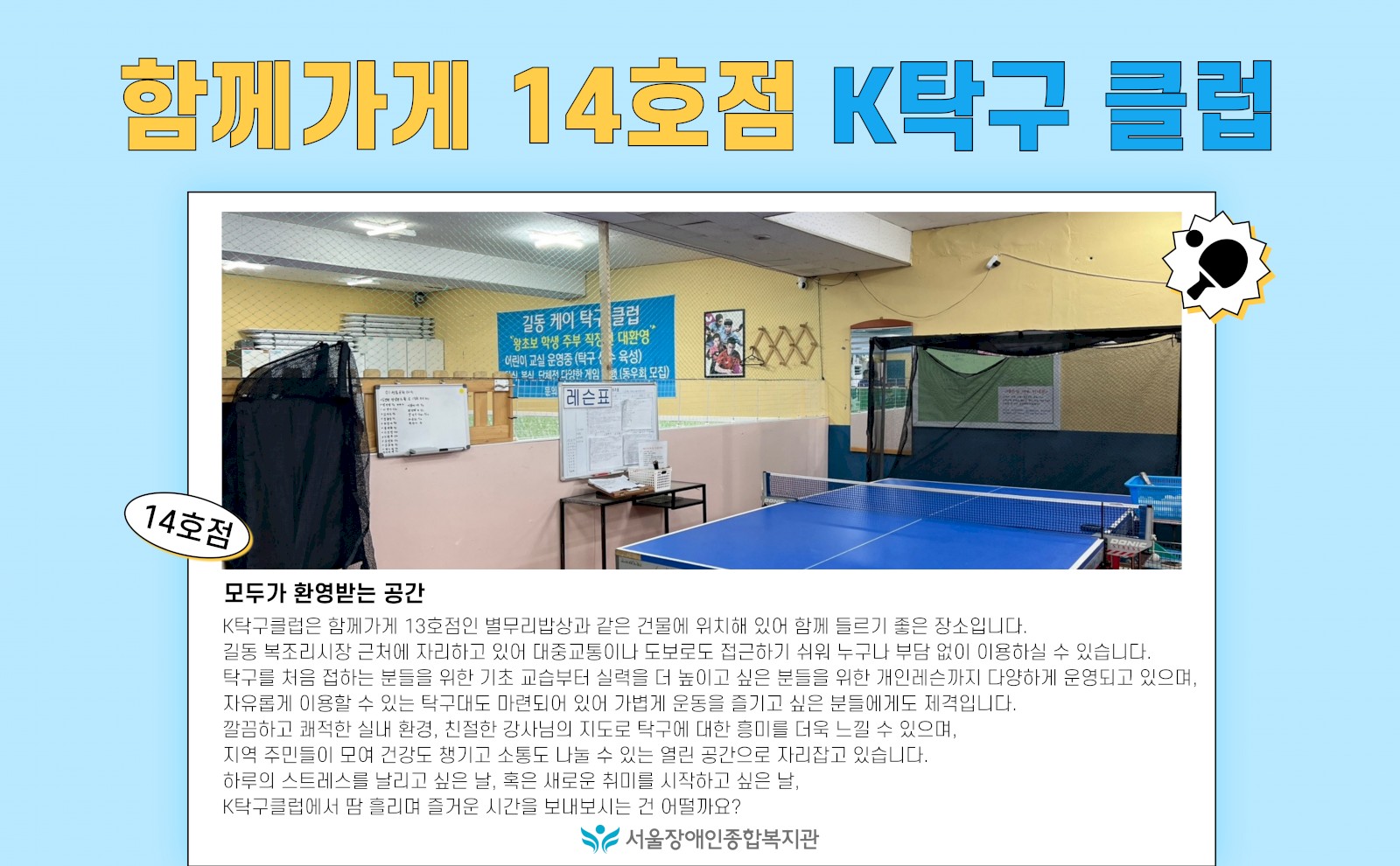 함께가게' 14호점, 'K탁구 클럽' | 장애·비장애 지역주민 모두 편안하게 이용할 수 있는 '함께가게'