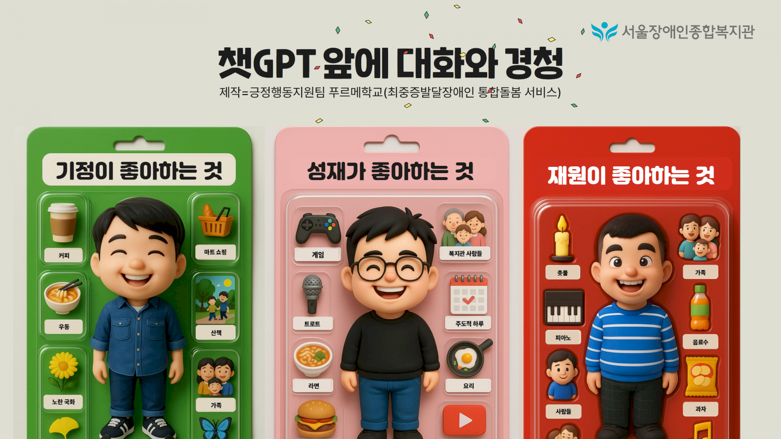 이번 피규어 시리즈는 챗GPT라는 기술을 활용하여, 푸르메학교 참여자들의 얼굴과 좋아하는 것들을 캐릭터로 표현했습니다. 하지만 그보다 더 중요한 건, 이 피규어들이 가족과 당사자가 나눈 대화의 결실이라는 점입니다.
