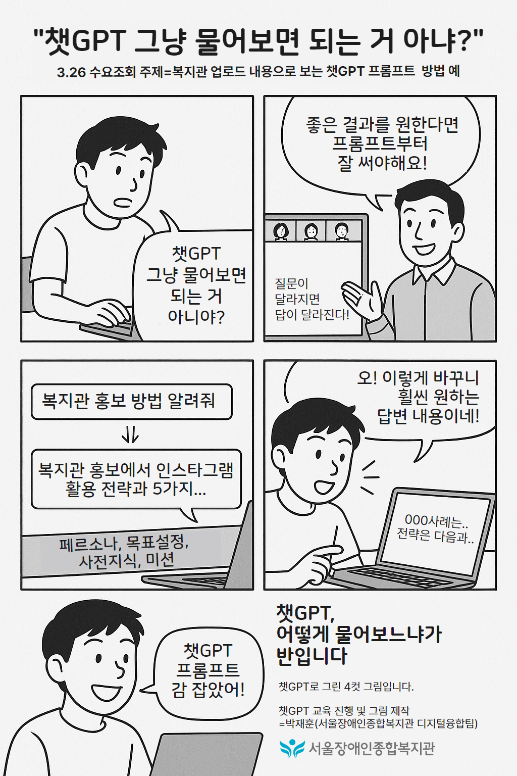 3월 26일(수), 아침에 열린 수요조회의 주제는 '복지관 업로드 내용으로 보는 챗GPT 프롬프트 방법 예'였습니다.