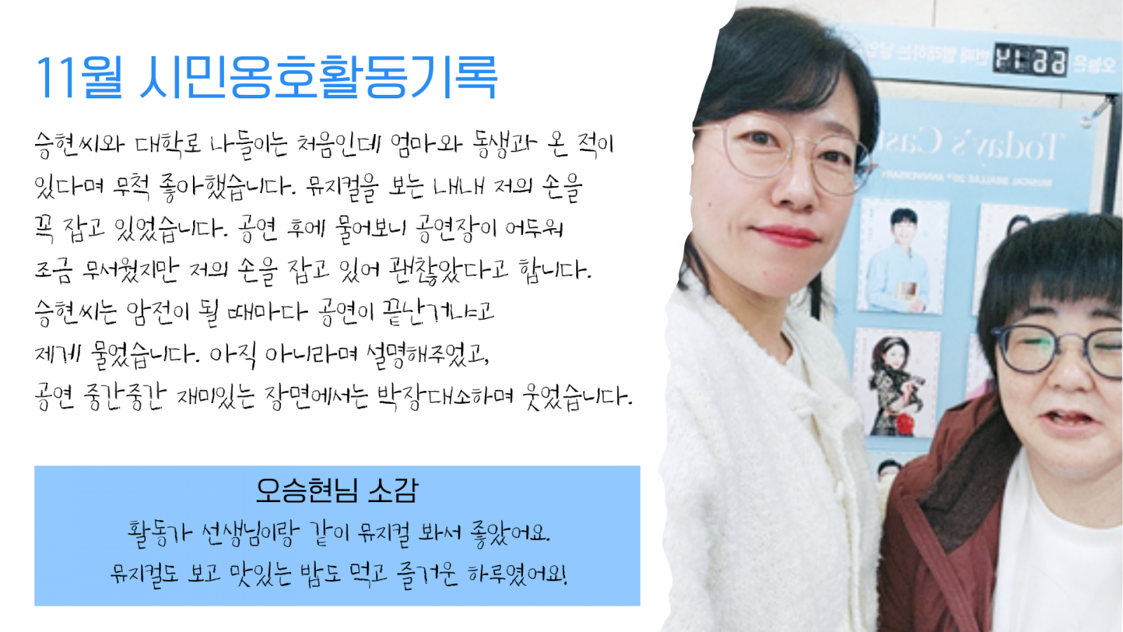 이처럼 시민옹호사업 속 만남들은 거창한 활동이 아니라, 함께 시간을 보내고 마음을 나누는 평범한 일상에서 만들어지고 있습니다.