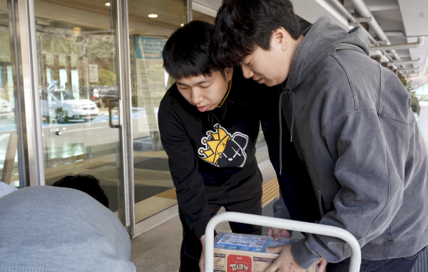 (사진=택배 물품을 옮기는 방기정 씨와 고동환 사회복지사)