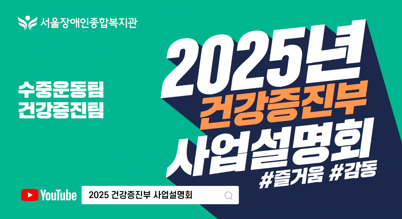 (영상 링크)2025년 건강증진부는 이렇게 일합니다 (수중운동팀, 건강증진팀) 페이지 정보 작성자 서울장애인종합복지관 작성일25-01-13 17:19 조회수114 본문 자세히 보기2025년 서울장애인종합복지관 건강증진부는 이런 일을 합니다.지금 서울장애인종합복지관 유튜브 채널에서 보실 수 있습니다.영상 제작 : 서울장애인종합복지관 디지털융합팀 [클릭! 수중운동팀 사업설명회 영상 보기][클릭! 건강증진팀 사업설명회 영상 보기] 목록 답변 이전글 (영상 링크)2025년 미래혁신부는 이렇게 일합니다 (기획협력팀, 디지털융합팀) 25.01.13 다음글 (영상 링크)2025년 지역포괄촉진부는 이렇게 일합니다 (지역옹호협력팀, 지역생활지원팀) 25.01.13