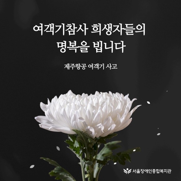 여객기참사 희생자들의 명복을 빕니다. 페이지 정보 작성자 서울장애인종합복지관 작성일24-12-31 14:50 조회수233 본문 자세히 보기 목록 답변 이전글 관장 최미영 취임사 및 신년사 "보통의 삶을 함께 만드는 사람들, 새로운 즐거움과 감동을 만드는 우리들" 25.01.02 다음글 서울장애인종합복지관 종무식 및 관장 이임식, 곽재복 관장 정년퇴임식 진행 24.12.31