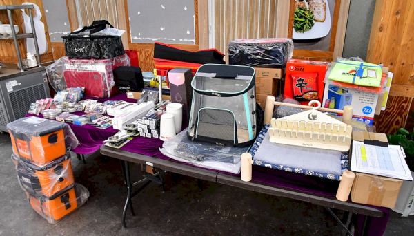 회원들과 낚시회사의 십시일반 후원으로 모인 바자회 상품들과 경매 상품들, 바자회는 10분만에 뜨겁게 종료