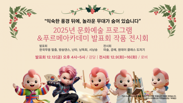 발표회 12.12(금) 오후 4시~5시 / 강당 | 전시회 12.9(화)~16(화) / 로비