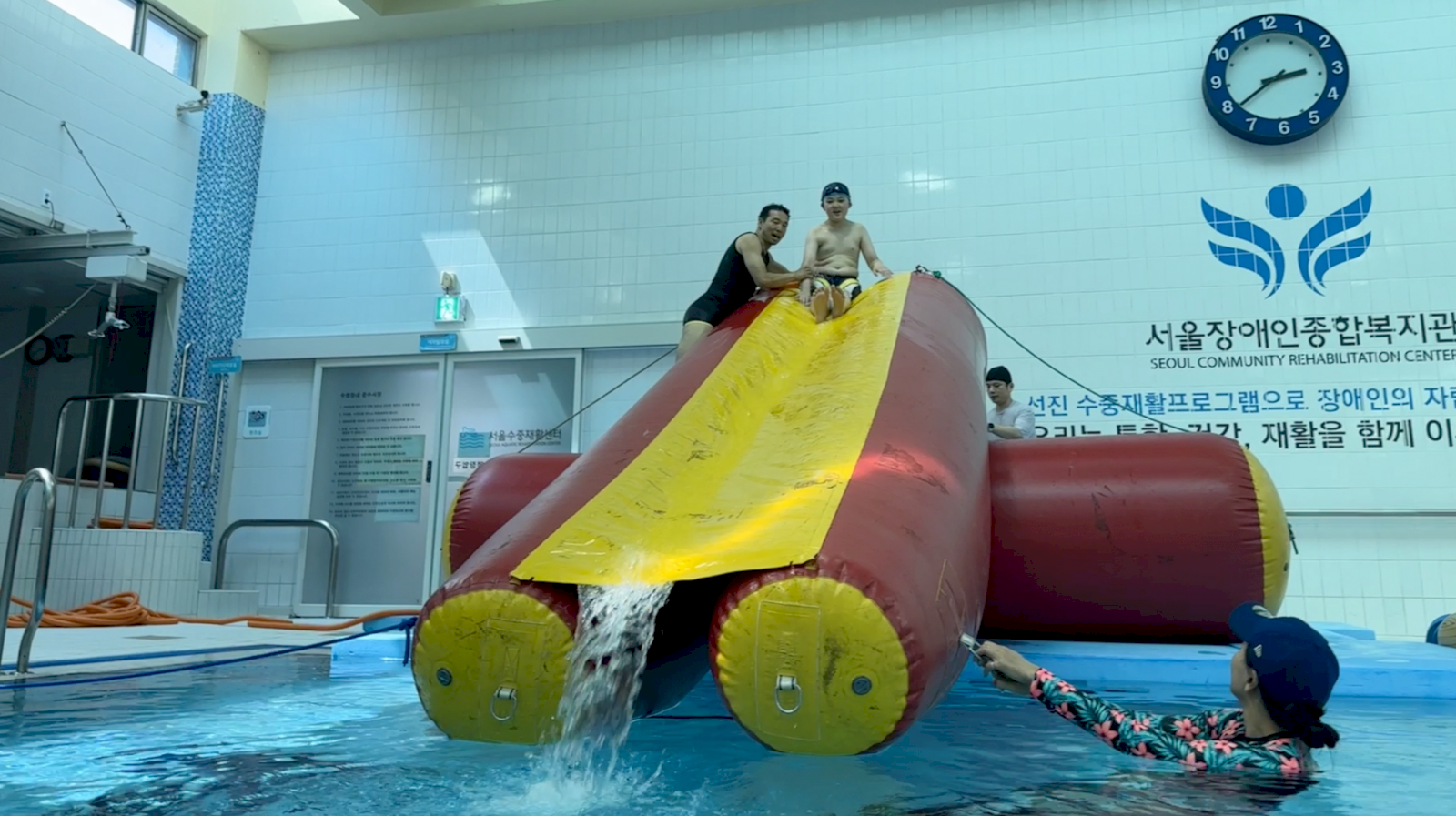 아빠와 아이가 무릎 높이의 물에서 달리기 시합을 했어요. 물의 저항력 때문에 신체조절이 어려운 아이도 자신 있게 뛰어다닐 수 있었어요.