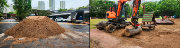 이에 공유자원부 운영지원팀은 모래놀이터의 기존 모래를 모두 제거하고, 권장 깊이에 맞는 모래를 포설하는 작업을 진행(2024년 4월 19일)했습니다.