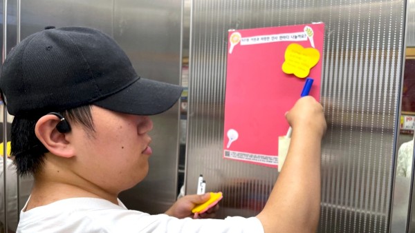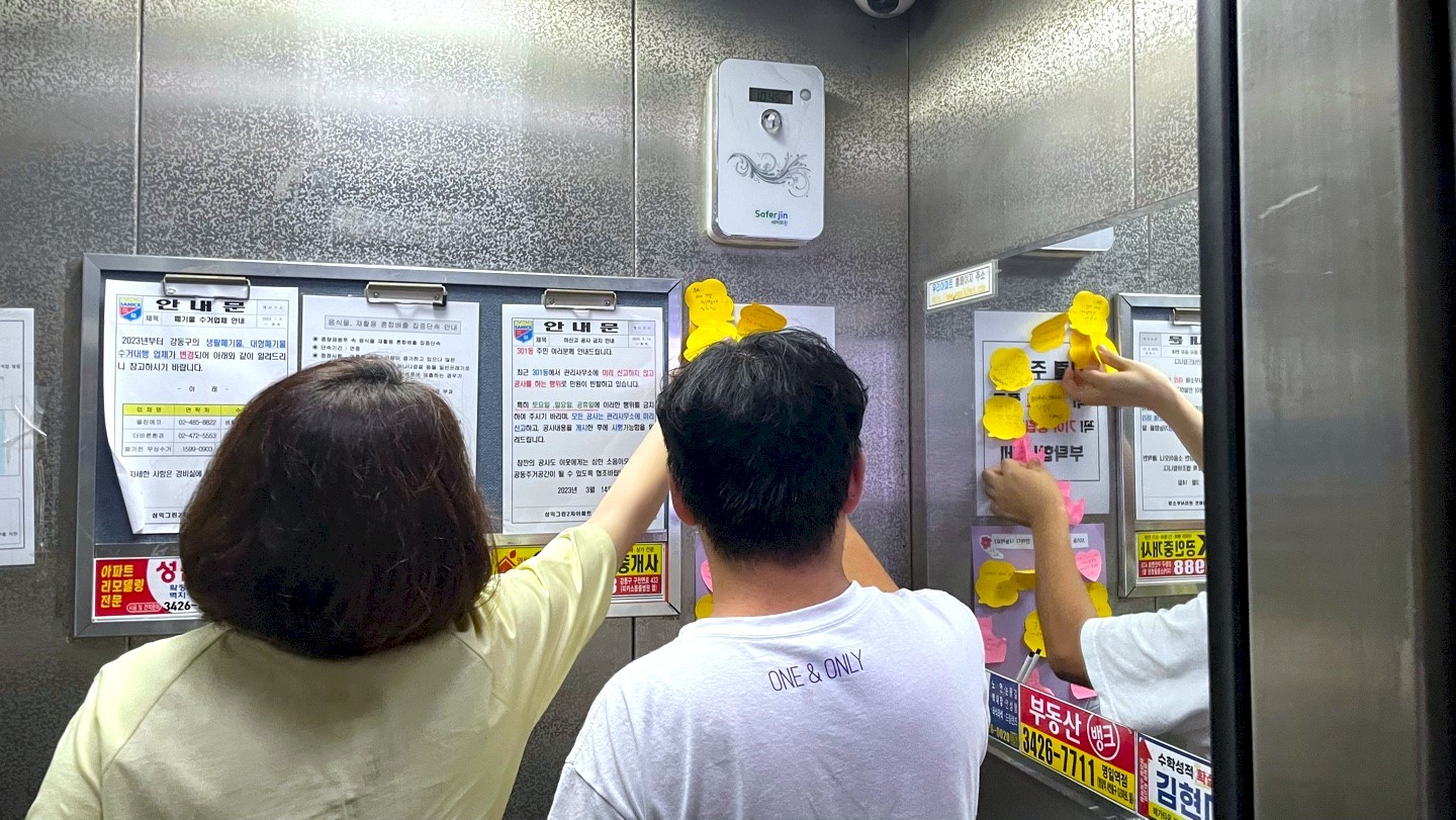 이후 본격적으로 아파트 곳곳 엘리베이터에 안내판을 부착하고, 포스트잇과 볼펜을 비치하기 시작했습니다.