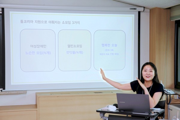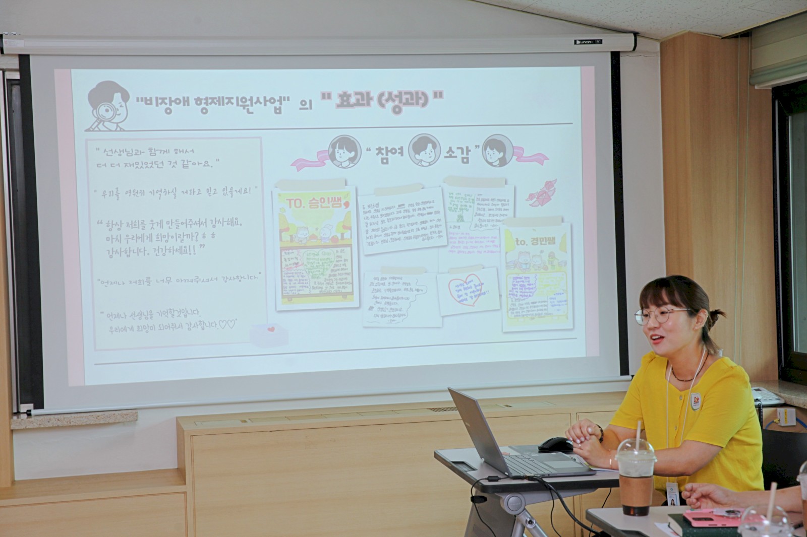 이어서, 올해 지원사업 중 15년간 돌코리아 기금으로 진행하고 있는 '비장애형제 프로그램'과 2023년 신규사업인 '사람중심 마을지향 지원사업'에 대해 자기주도지원부 오경민 사회복지사와 지역포괄촉진부 반미소 사회복지사가 사업의 목적과 현황, 당사자와 가족에 주는 의미있는 변화 등을 진정성있게 전달하여 후원금의 가치와 기관의 책임성 있는 사용을 전달했습니다.