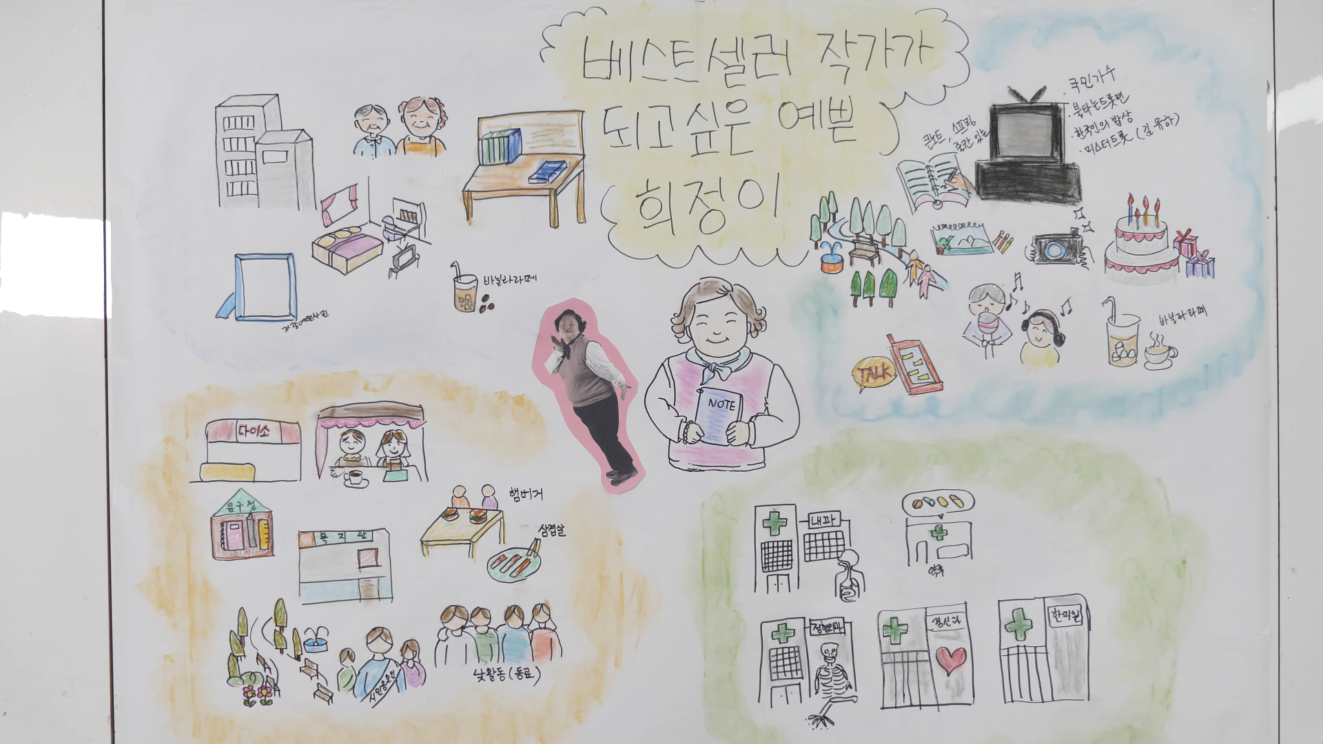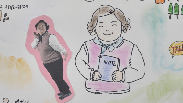 첫 회의로 황희정 님의 삶의 그림(Picture of Life) 회의를 진행했습니다. 황희정 님이 본인의 행복한 삶에 있어 필요한 것들을 이야기한 것들을 모아 그림으로 그려 보았습니다. 황희정님은 꿈을 “베스트셀러 작가가 되고 싶다”고 하였고, “오늘 이 시간이 행복하고 즐거웠다. 사진을 찍어서 엄마에게 빨리 보여주고 싶다“라고 이야기하였습니다.