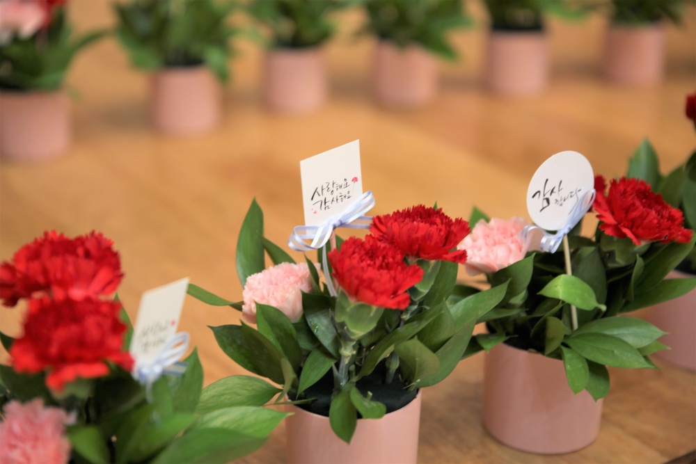 ▲ 왼쪽: 성가정노인종합복지관 카네이션 꽃바구니 전달 모습 / 오른쪽 :시립고덕양로원 카네이션 꽃바구니 전달 모습