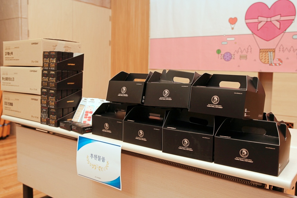 (사진)커피베이 후원품 전달식 모습 및 전달한 후원품들