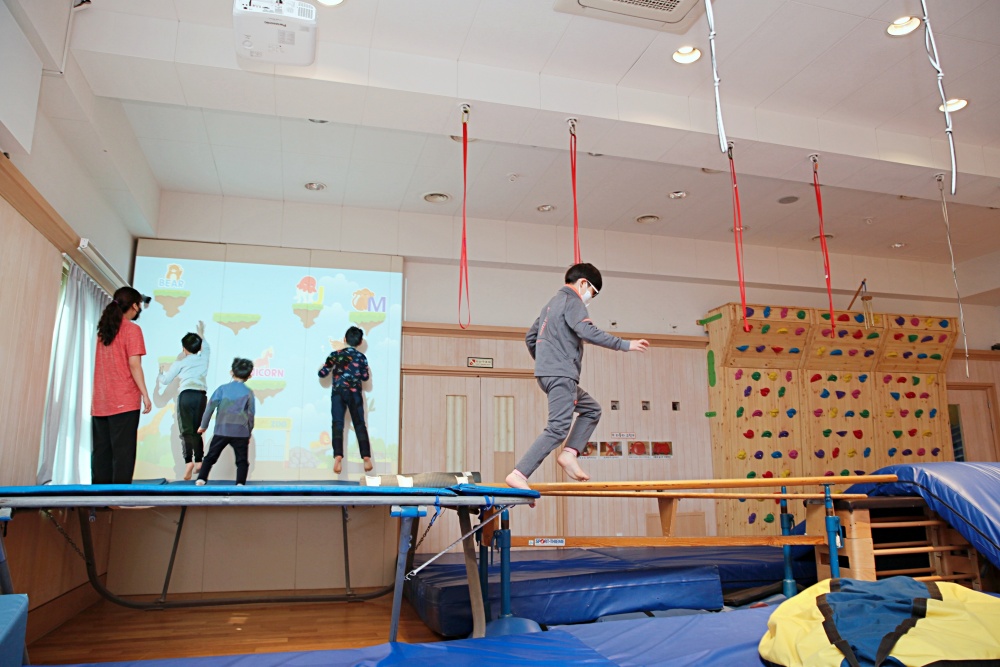 디지털 공간 및 콘텐츠를 경험하는 것과 재활에 필요한 활동이 조화롭게 연결된 곳. 그래서 트램펄린 운동과 벽면 터치 콘텐츠를 함께 즐기고, 심리운동 동선이 바닥 터치 콘텐츠로 이어지며, 모션 인식 콘텐츠로 더 다양한 심리운동 프로그램을 만들어갈 수 있는 스마트발달트레이닝 서비스가 시작됐습니다.