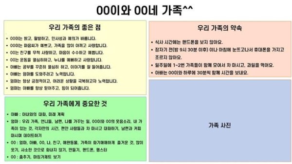 “우리 가족의 장점, 우리 가족의 약속을 정하고 액자에 담아주시니 정말 좋아요. 모두 잘 보이는 거실에 놓고 가족 약속을 지키도록 노력해야겠어요.”