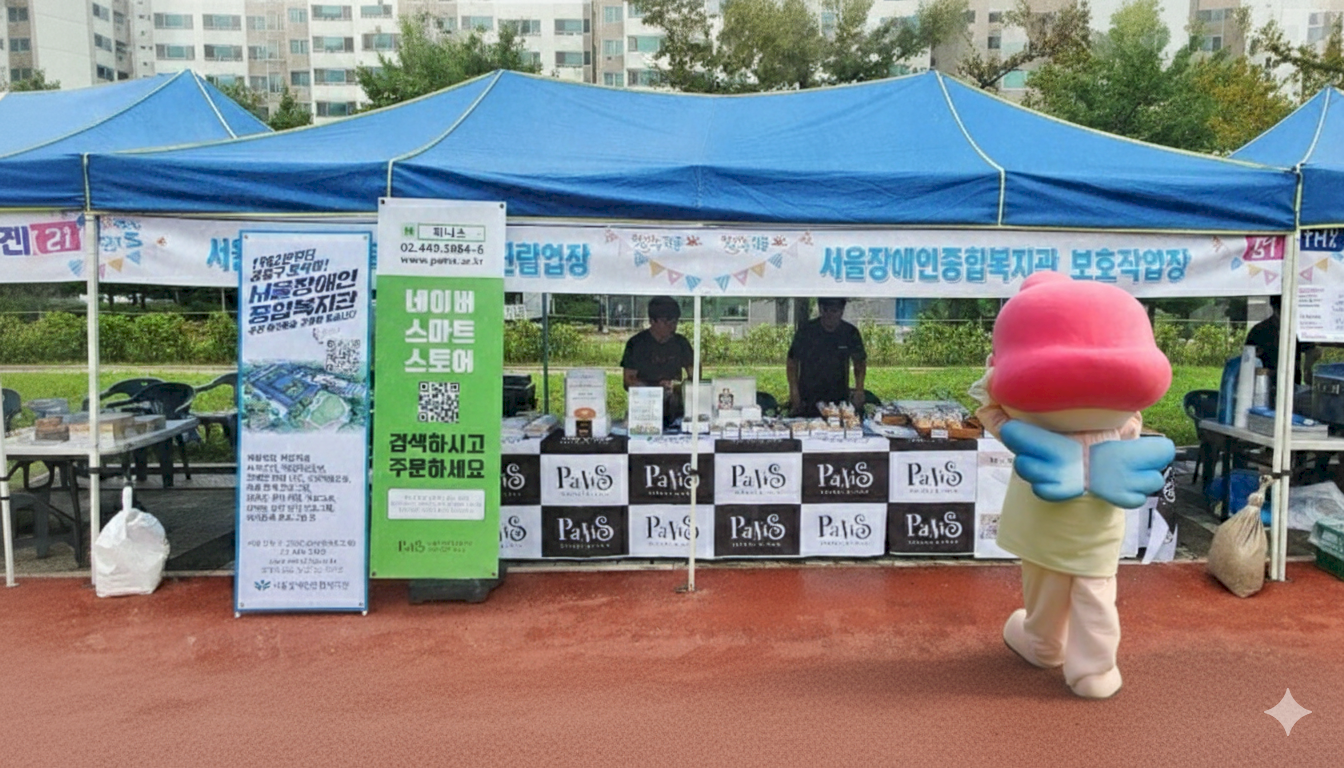 그리고 저는 보호작업장 파니스 부스 앞에 늠름하게 자리를 잡았습니다.