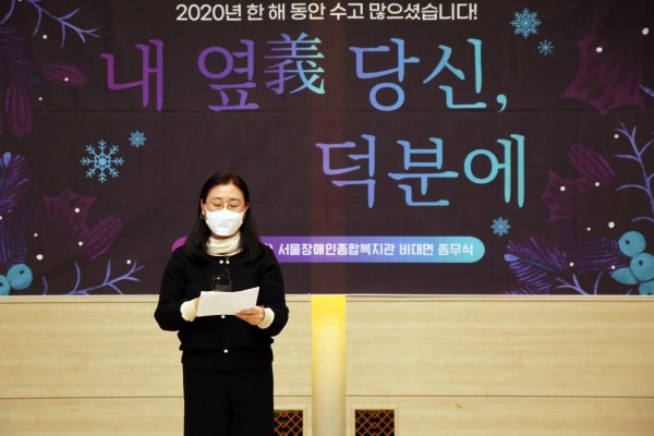 이날 종무식에서 곽재복 관장은 "코로나19 속에서 애써 준 직원들에게 정말 감사를 전합니다. 올해 우리가 얻은 배움과 실천 경험은 내년 사업 모토인 '당사자 일상 공간에서의 실제 삶 지원'을 실천하는 밑바탕이 될 것입니다."라며 직원들에게 감사와 격려 메시지를 전했습니다.