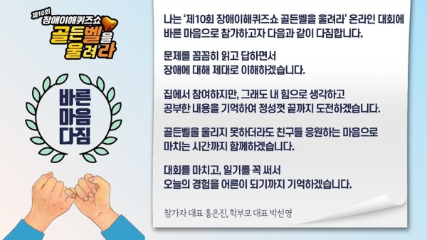평소 학교에서 장애가 있는 짝꿍을 더할 나위 없이 잘 이해하며 도와준다는 박예지 양은 이번 온라인 골든벨 퀴즈쇼를 위해 예상문제는 물론 장애 이해와 관련된 책도 찾아보며 열심히 준비했다고 합니다.