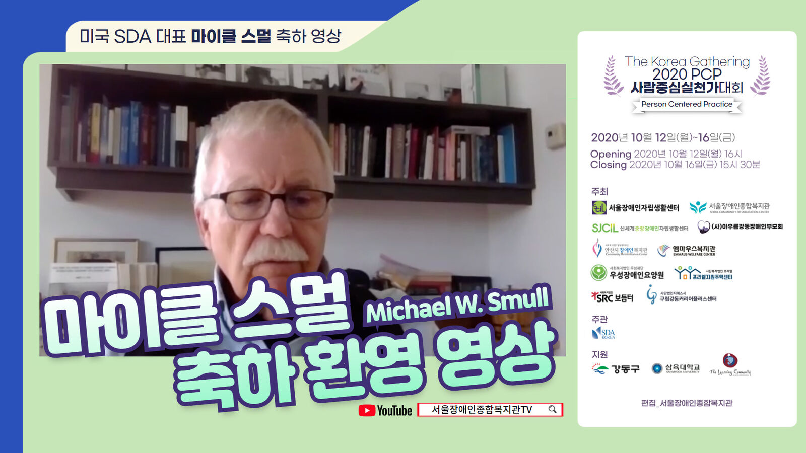 2020년 10월 12일(월)~16일(금)까지 열리는 PCP 사람중심실천가대회에 서울장애인종합복지관 공동 주최 기관으로 참여하여 개회식 및 사례발표도 하였습니다. 12일 줌(ZOOM)으로 진행한 개회식에 미국 TLCPCP, PCT 창안자인 마이클 스멀 SDA 대표가 영상으로 개최 축하 및 참가자에 대한 환영 영상을 보내왔습니다. 중간중간 우리말도 쓰며 마음을 담았습니다.