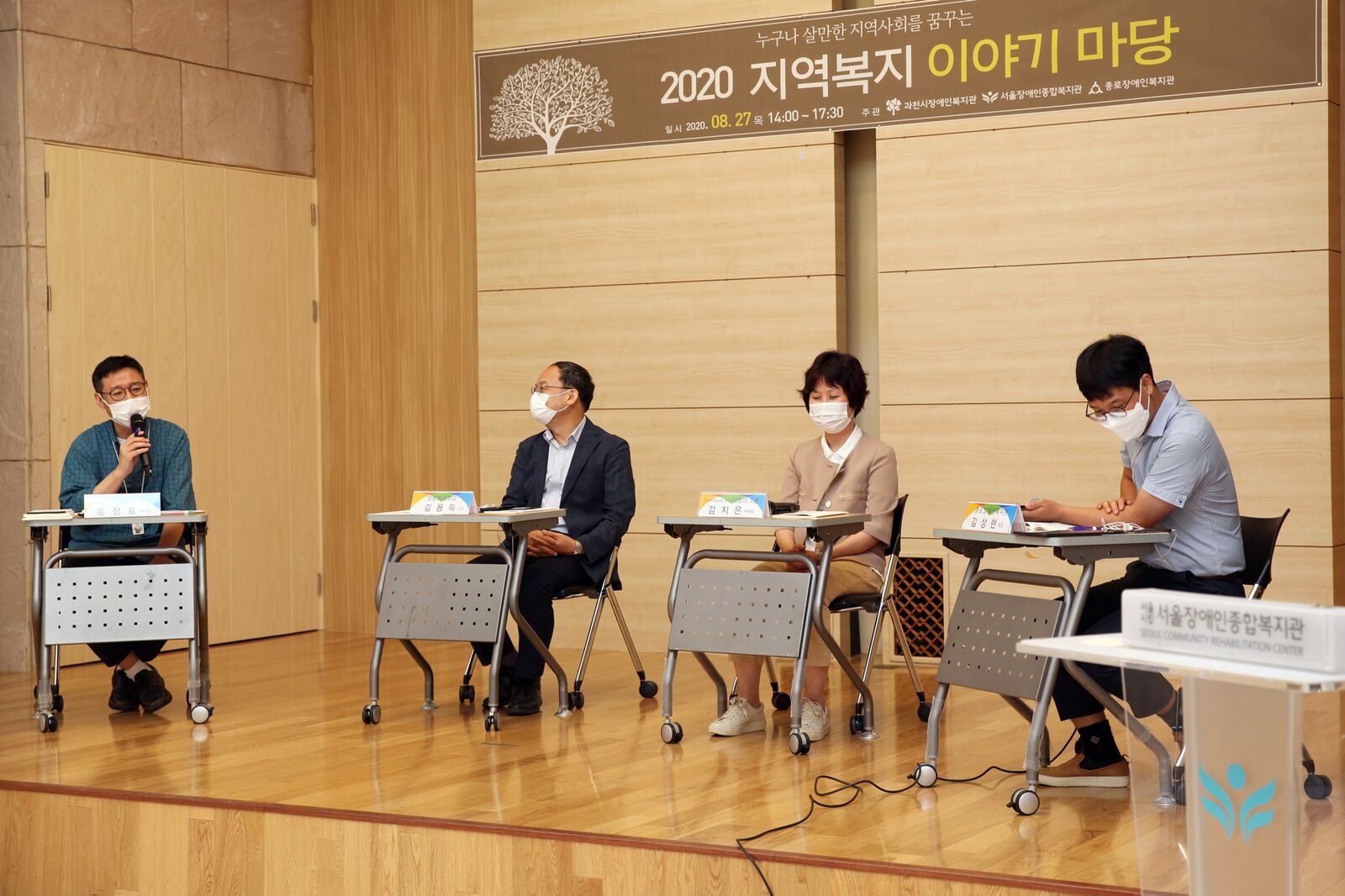 이야기 나눔 시간 현장 패널로 자리한 (사진 왼쪽부터)서울장애인종합복지관 지역포괄촉진부 홍정표 부서장, 성공회대학교 사회복지학과 김용득 교수, 사람과소통(언어치료 AAC센터) 김지은 부센터장, 종로장애인복지관 김상현 팀장 모습