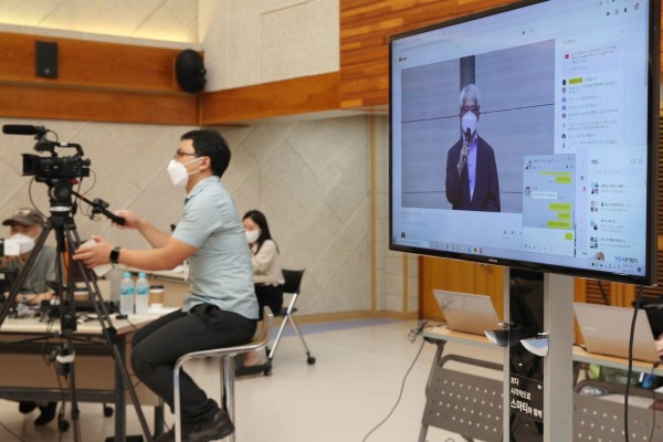 (사진 왼쪽)현장에서 인사말을 전하는 서울장애인종합복지관 곽재복 관장, (오른쪽)영상으로 축사를 전하는 서울시 장애인자립지원과 이병욱 과장
