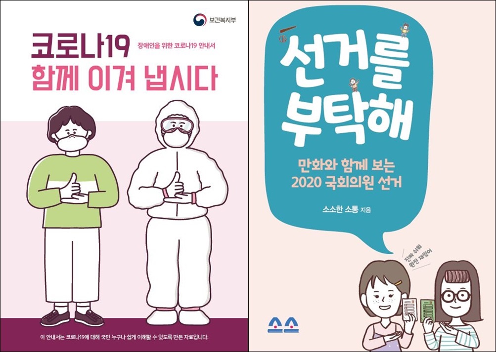 (좌)보건복지부가 배포하는 '장애인을 위한 코로나19 안내서', (우)발달장애인의 국회의원 선거를 돕는 책 '선거를 부탁해' _ 소소한 소통 제작