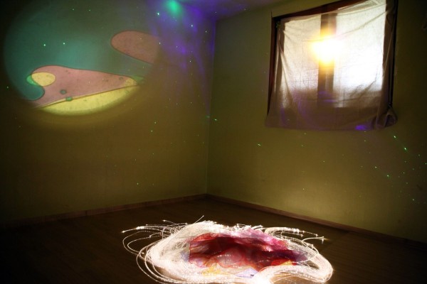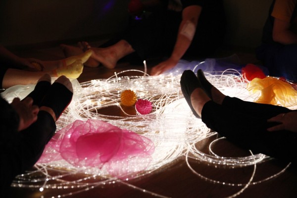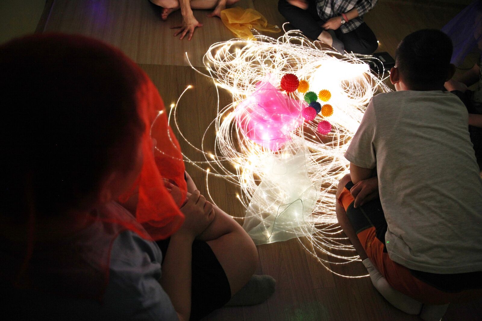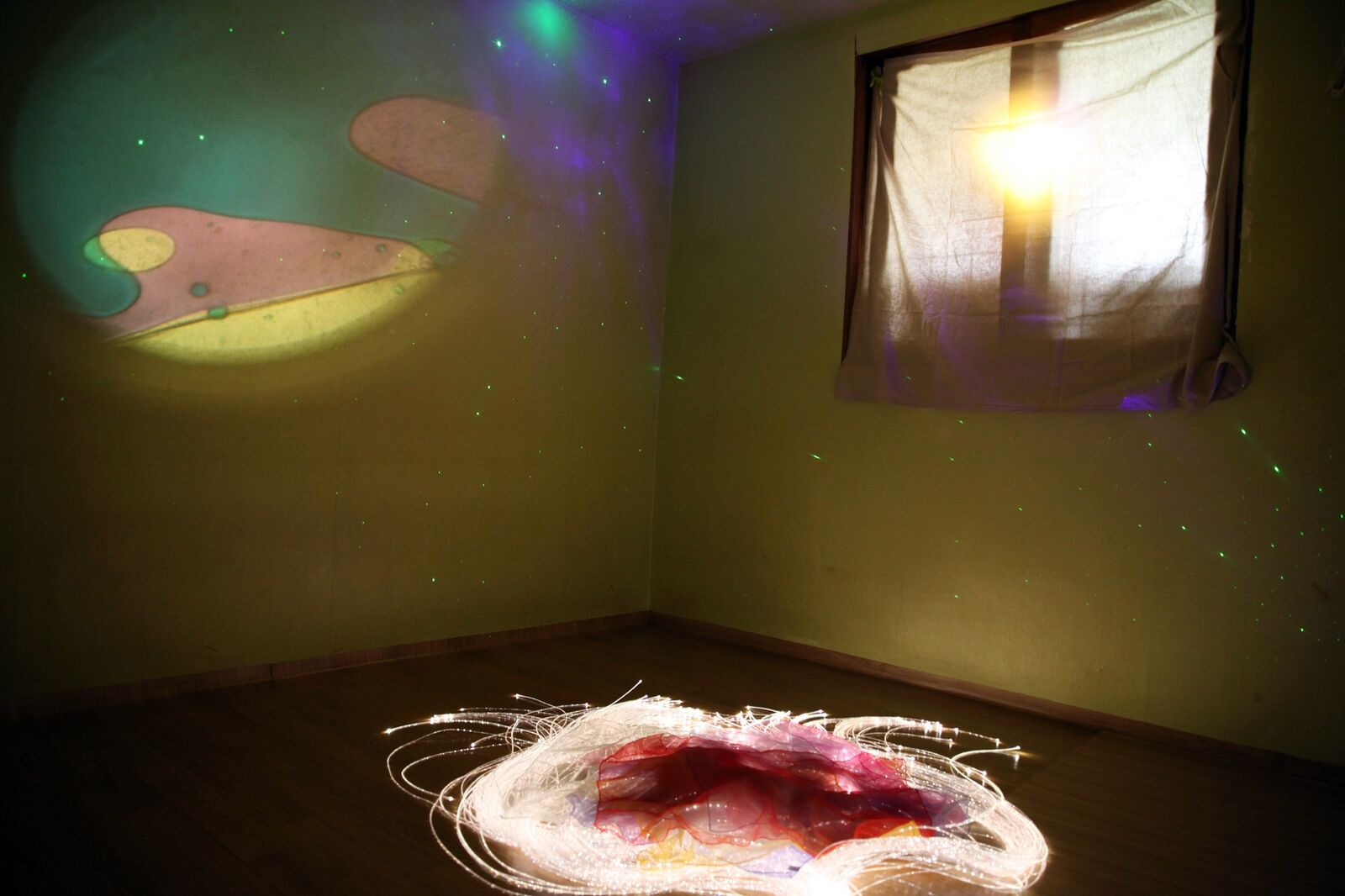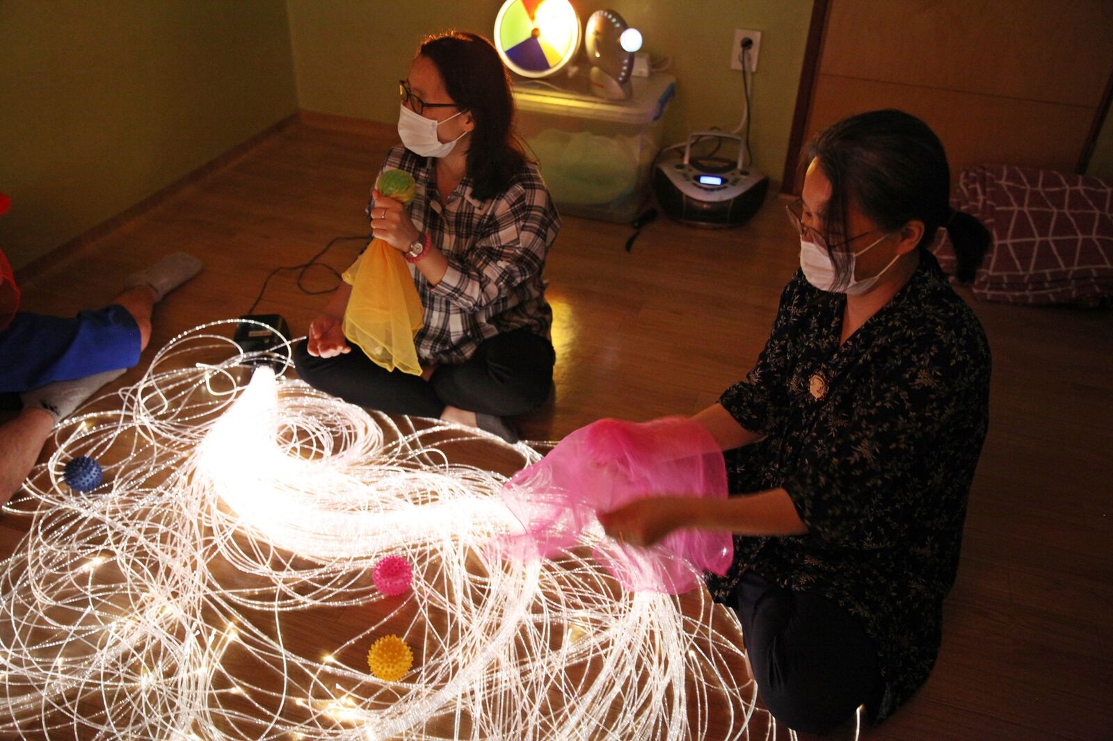 복지관에서 준비해 간 여러 가닥의 긴 줄이 빛을 내는 광섬줄, 다양한 색깔의 쉬폰 천, 깨끗하게 소독한 고슴도치 볼, 어두운 벽면을 여러 가지 색으로 비춰주는 색광판, 특별히 우주 속 분위기로 꾸며주는 조명(스페이스 프로젝트, 레이저 트와일라이트) 등을 활용했습니다.