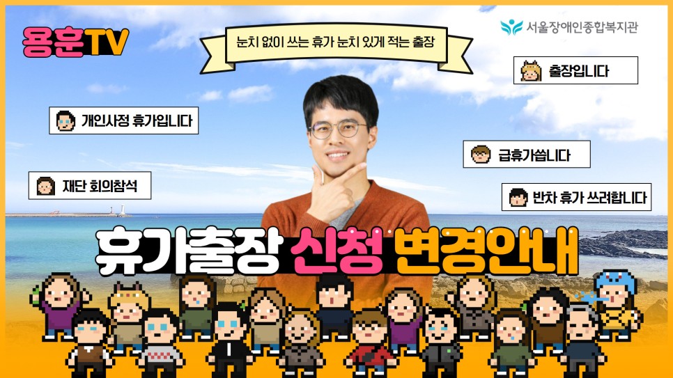 휴가를 다양한 방법으로 쓸 수 있도록 노력하는 복지관. 운영지원팀의 담당 직원은 그 방법과 새롭게 도입한 시스템을 소개하는 영상을 제작하기로 했습니다. 주말에도(?) 다시 녹음을 했다고 합니다. (약간 펙트체크가 필요한 부분입니다. ㅎ)