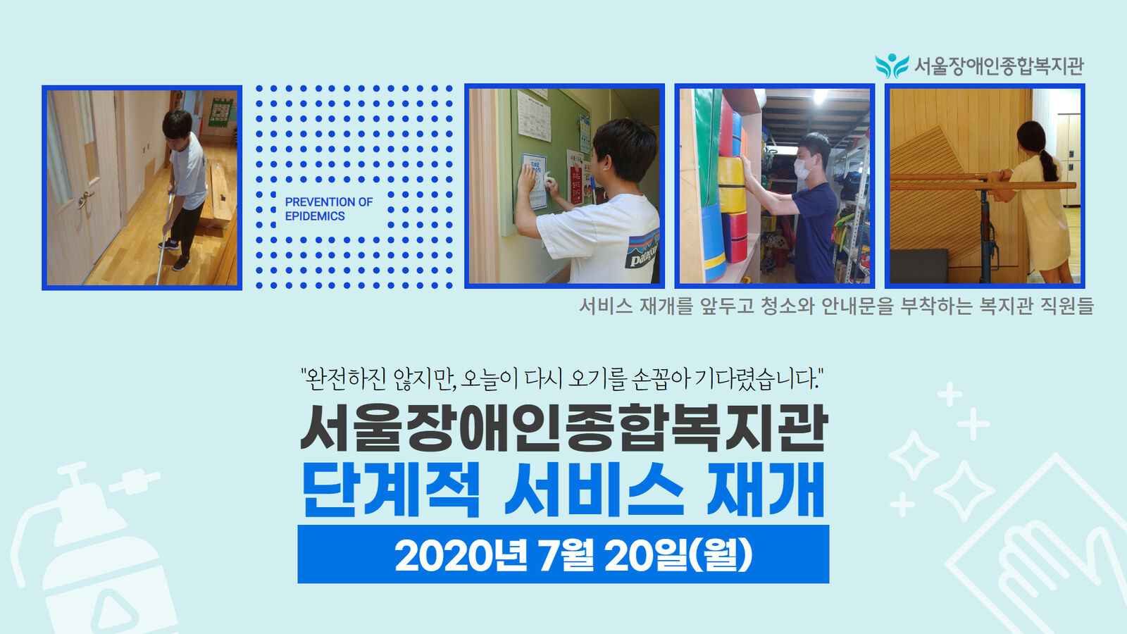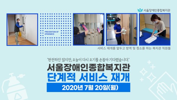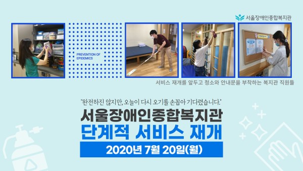 7월 20일 서비스 재개를 앞두고 방역과 청소를 한 직원들 페이지 정보 작성자 서울장애인복지관 작성일20-07-18 10:28 조회수941 본문 자세히 보기 "완전하진 않지만, 오늘이 다시 오기를 손꼽아 기다렸습니다." 2020년 7월 20일(월), 서울장애인종합복지관 단계적 서비스 재개 모두를 만날 순 없지만, 잠시 떨어져 있던 분들을 다시 만나게 되어 기쁩니다. 다시 만나게 될 그곳을 직원들은 다시 한 번 더 깨끗하게, 살피고자 했습니다.방역, 소독, 청소 등등.. 그 공간을 여러분 다시금 채워갑니다. 자세히 보기 자세히 보기 목록 답변 이전글 오늘을 손꼽아 기다렸어요_7월 20일 서비스 재개(1단계 운영) 20.07.21 다음글 직원 교육용 영상을 만들기 시작한 공유자원부 직원들, 잠시 유튜버가 되다! 20.07.18
