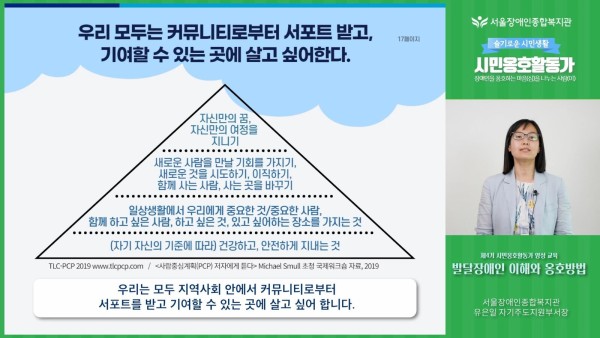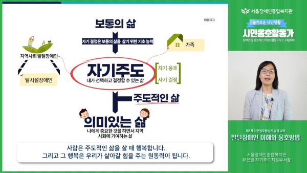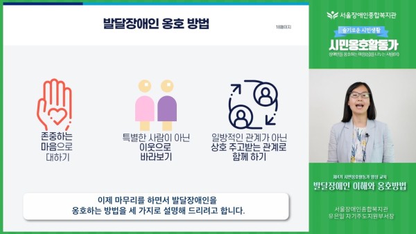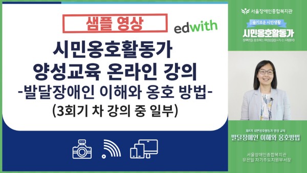 서울장애인종합복지관은 코로나19 상황(6.30 기준 코로나19 대응 서비스 체제 운영) 속에서 시민옹호활동가 양성 교육을 온라인 강좌 사이트인 에드위드 내에 서울장애인종합복지관 클래스를 개설하여 온라인 강의 형식으로 진행하고 있습니다.3회기 차 교육인 '발달장애인 이해와 옹호 방법'의 강사 인사말과 뒷부분 5분을 담고 있습니다. 그럼 영상 함께 보겠습니다. 이 영상은 복지관 온라인 강의 영상 구성과 내용에 대해 궁금한 분들을 위한 샘플 영상입니다.