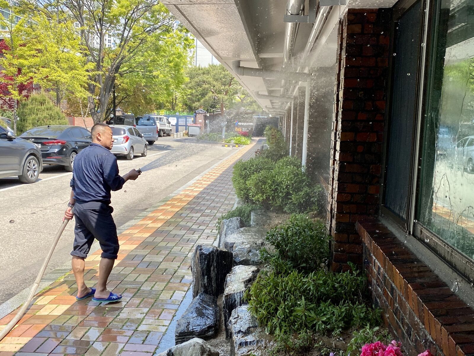 4월 28일(화), 서울장애인종합복지관 공유자원부 직원들은 소매를 걷어 올리고, 건물 외벽, 유리창 물청소를 시작하였습니다.