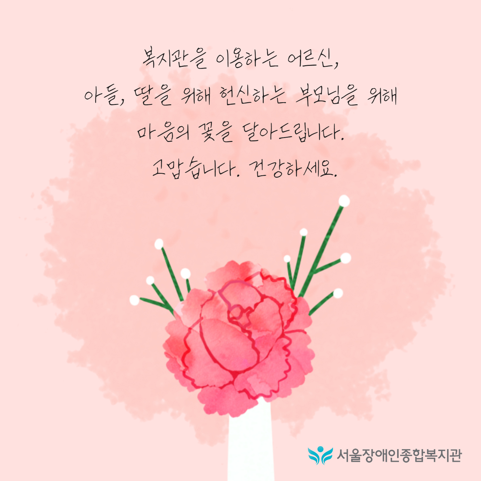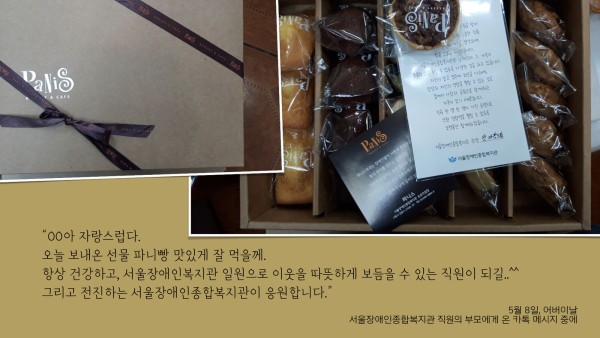 "...작은 선물을 준비했습니다. 서울장애인종합복지관은 장애인과 그 가족의 보통의 삶을 누릴 수 있도록 최선을 다하며, 당당히 자신의 역량을 펼칠 수 있는 것은 곁에서 사랑과 응원으로 함께하는 가족이 있기 때문입니다. 직원 한 명 한 명이 가진 능력으로 선한 영향력을 펼칠 수 있도록 오랫동안 함께하겠습니다..."