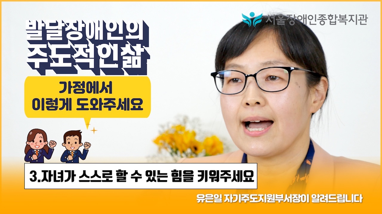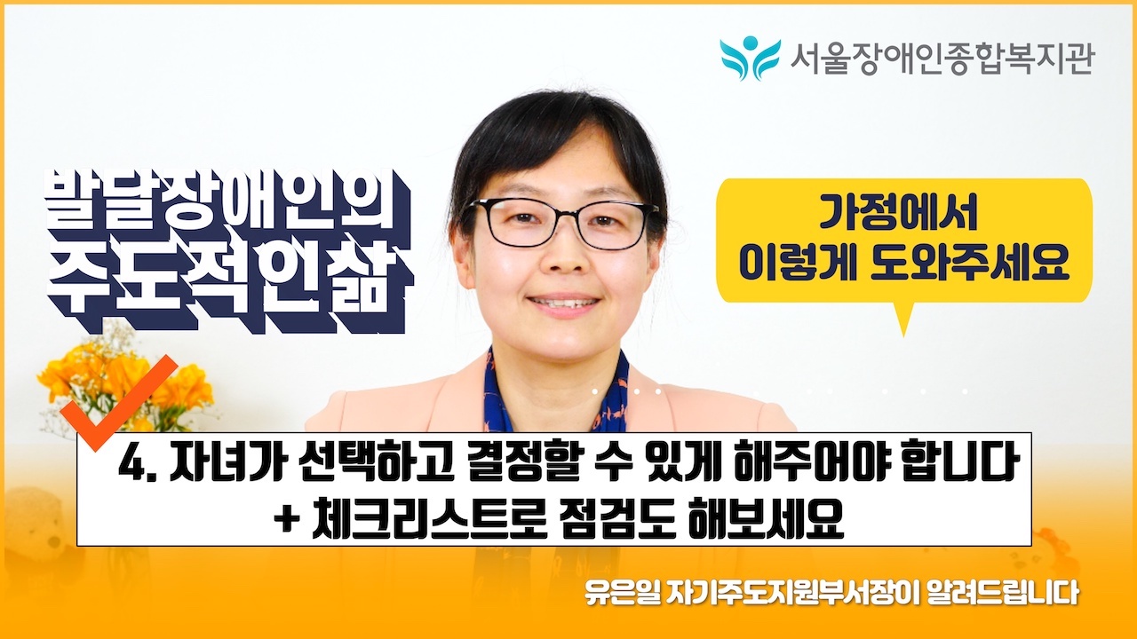 이에 자기주도지원부와 기획협력팀은 <발달장애인 주도적인 삶 가정에서 이렇게 도와주세요> 영상을 제작하였습니다.
