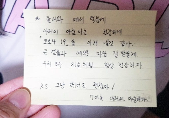 윤서와 예서 덕분에 아저씨 아줌마는 건강하게 코로나19를 이겨낼 것 같아. 큰 선물과 예쁜 마을 잘 받을게. 우리 모두 지금처럼 항상 건강하자.