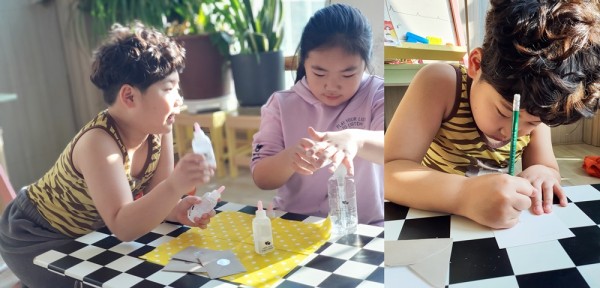 자녀들과 함께 손소독제를 만들고, 이웃에게 전할 엽서를 쓰는 모습을 보내주셨습니다.