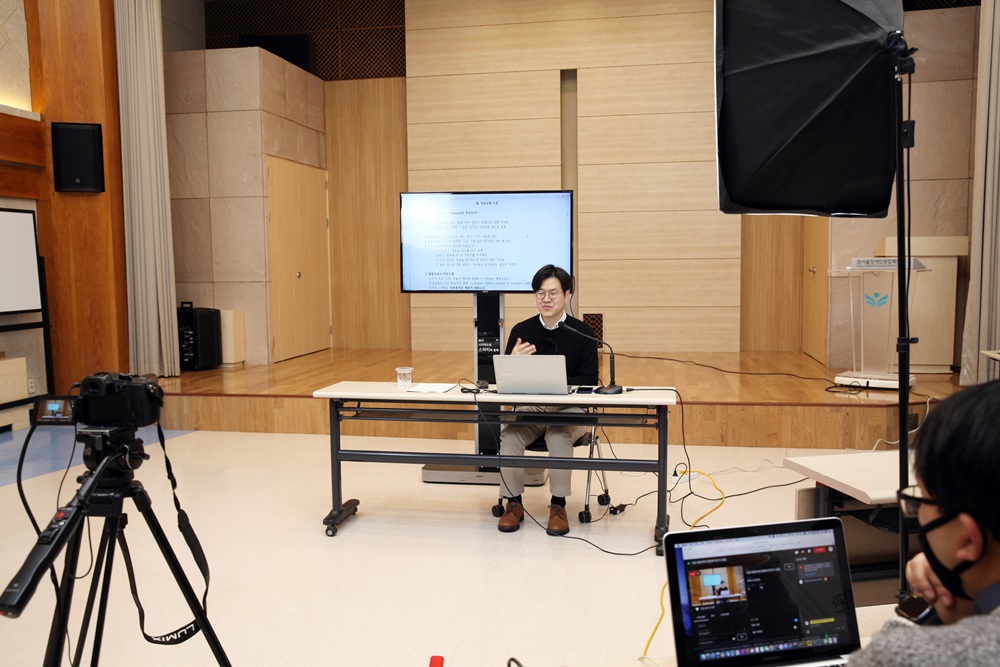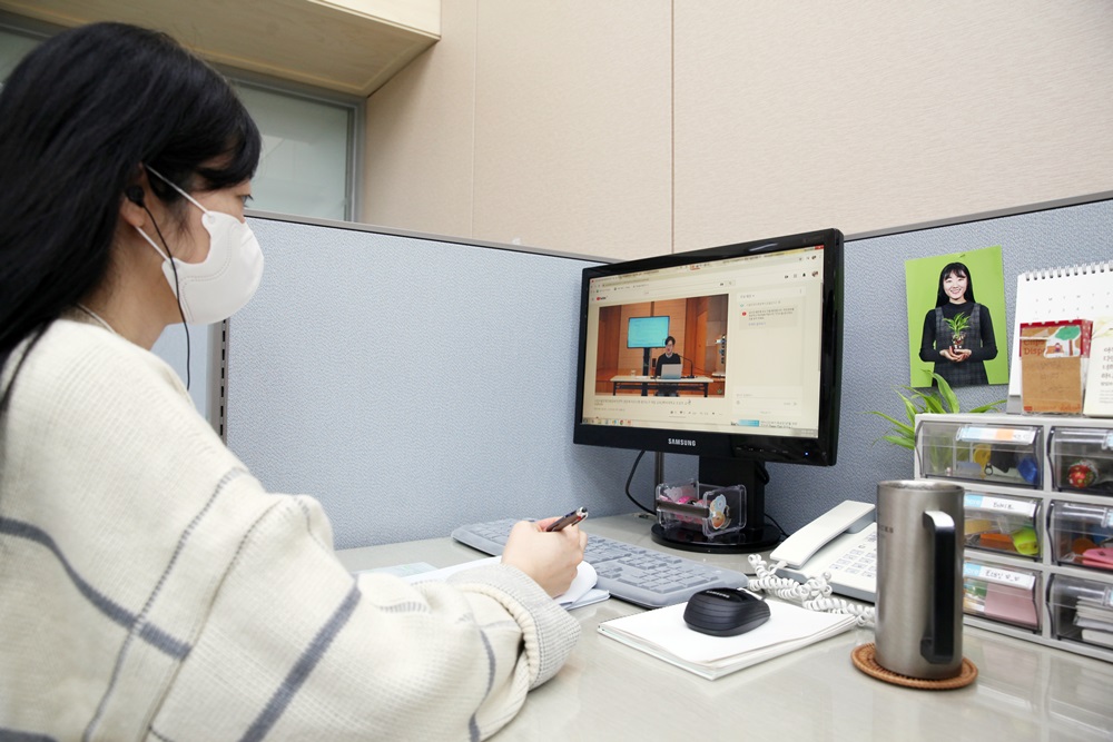 강당에서 백석대학교 조성우 교수의 ‘직무수행 평가도구 개발’ 교육을 촬영하고, 직원들은 사무실 내 각자 자리에서 PC와 휴대폰으로 스트리밍 영상을 시청했습니다.